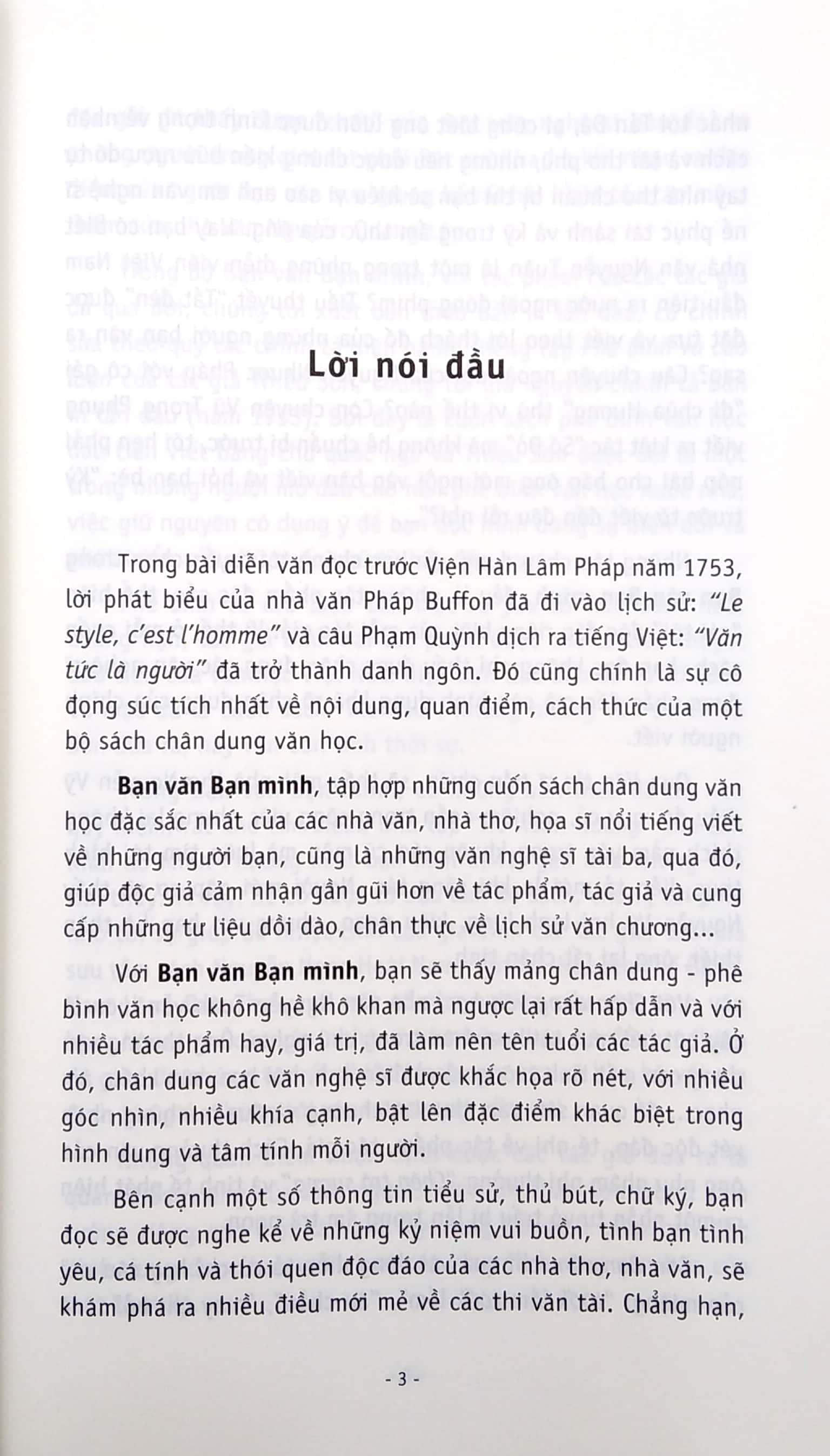Bạn văn bạn mình (trọn bộ 10 quyển) NHÀ VĂN TRONG MẮT NHÀ VĂN Trong diễn văn đọc trước Viện Hàn Lâm Pháp năm 1753, phát biểu của nhà văn Pháp Buffon đã đi vào