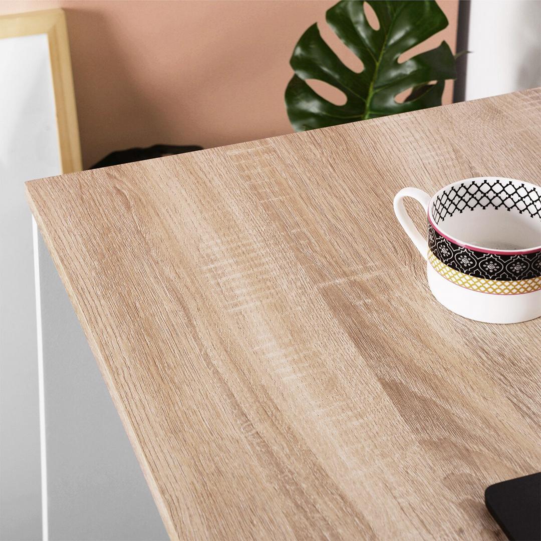 - Tên sản phẩm: Bàn làm việc kèm ngăn kéo và kệ để đồ - Chất liệu: Gỗ MDF phủ melamine cao cấp chống xước - chân bàn gỗ tự nhiên - Màu sắc: Vân gỗ sồi - Kích thước: 80/120 x 55 x 82cm (dài x rộng x cao) - Công năng: Là mẫu bàn làm việc, bàn học giúp tiết kiệm diện tích không gian phòng
