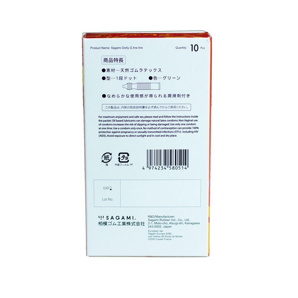 - Có gai (Chấm nổi), một lần thắt tạo cảm giác mới lạ, kích thích khi quan hệ. - Công nghệ khử mùi hiện đại giúp loại bỏ mùi cao su khó chịu, đây là ưu điểm khi dùng Bao cao su Sagami Are Are nói riêng cũng như các dòng sản phẩm bao cao su Sagami nói chung, dù là hàng cao cấp hay hàng bình dân. THÔNG TIN SẢN PHẨM: