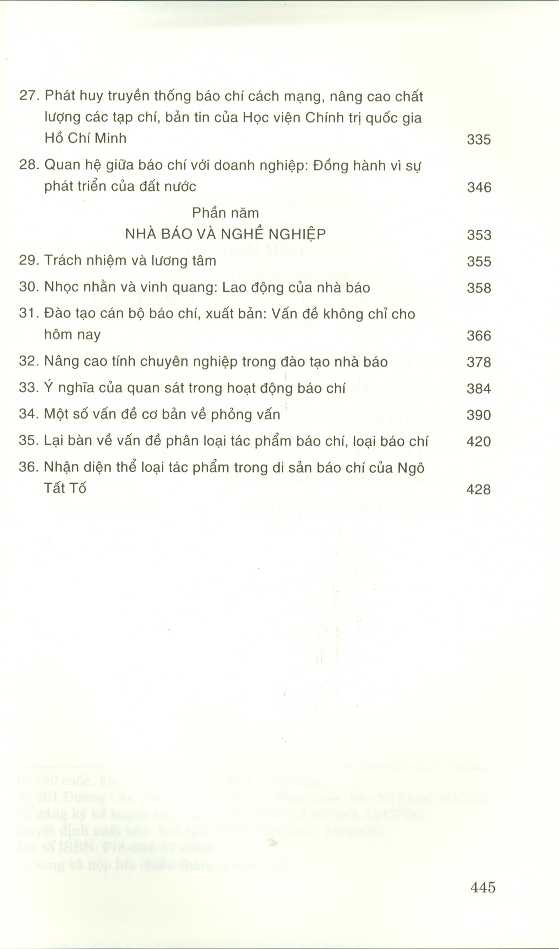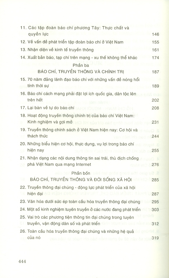 Mua tại TiktokCuốn sách tổng hợp các bài viết về báo chí, truyền thông từ thuở sơ khai đến hiện đại, đồng thời gắn báo chí, truyền thông với các vấn đề về kinh tế – xã hội, chính trị, đời sống xã hội; với trách nhiệm và công tác chuyên môn, nghiệp vụ của người làm báo. Cuốn sách được chia thành 5 phần với 36 bài viết: Hồ Chí Minh – Người khai sinh nền báo chí cách mạng Việt Nam; Sự phát triển báo chí, truyền thông hiện đại; Báo chí truyền thông và chính trị; Báo chí, truyền thông và đời sống xã hội; Nhà báo và nghề nghiệp.