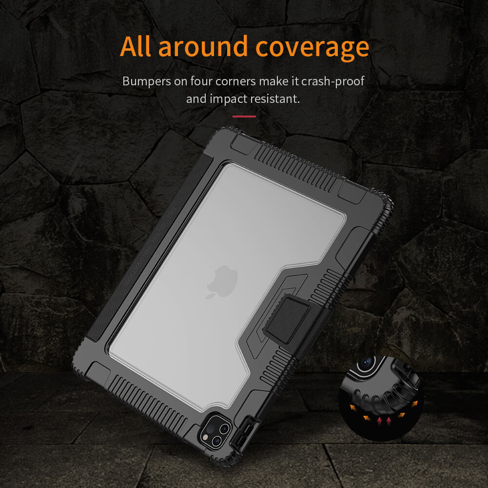 Bao da iPad Pro 11 2020 chống sốc hiệu Nillkin Bumber có ngăn đựng bút với Phần ốp lưng chống sốc bao phủ xung quanh cạnh viền bởi một lớp cao su chống sốc, giúp tăng khả năng chống va chạm và va đập vào máy. Tăng độ bền cho máy trong quá trình sử dụng.