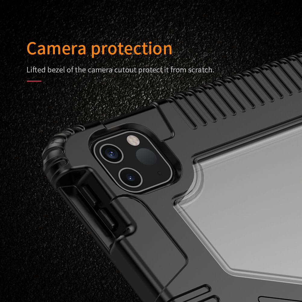 Bao da chống sốc cho iPad Pro 11 2020 hiệu Nillkin Bumber có ngăn đựng bút có Cạnh viền được thiết kế nhô cao giúp bảo vệ camera của chiếc iPad Pro 11 2020 tránh bị trầy xước va chạm.