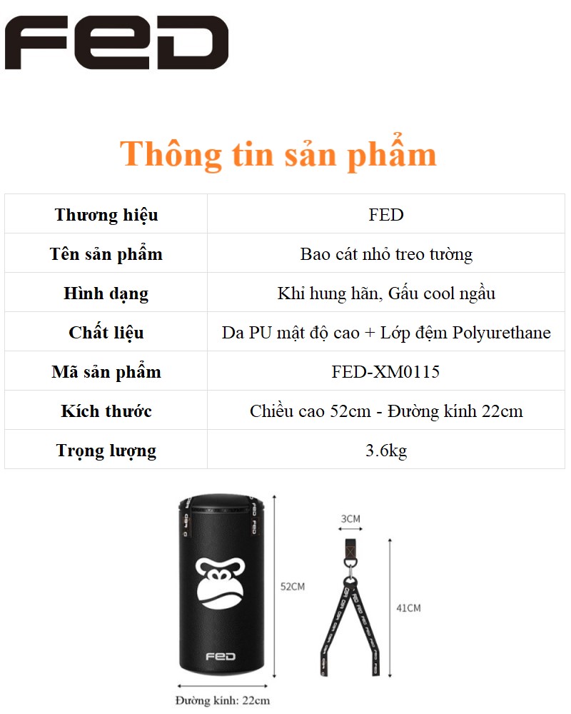 * THÔNG SỐ KỸ THUẬT CỦA TRỤ BOXING FED-8725 CAO CẤP. - Xuất xứ: Trung Quốc. - Mã sản phẩm: 8725. - Tổng chiều cao sản phẩm: 175 cm. - Cân nặng: 23kg - Kêt