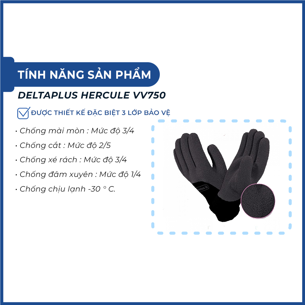 Với những tính năng và ưu điểm trên, găng tay Deltaplus HERCULE VV750 là lựa chọn đáng tin cậy cho người lao động trong môi trường lạnh giá.