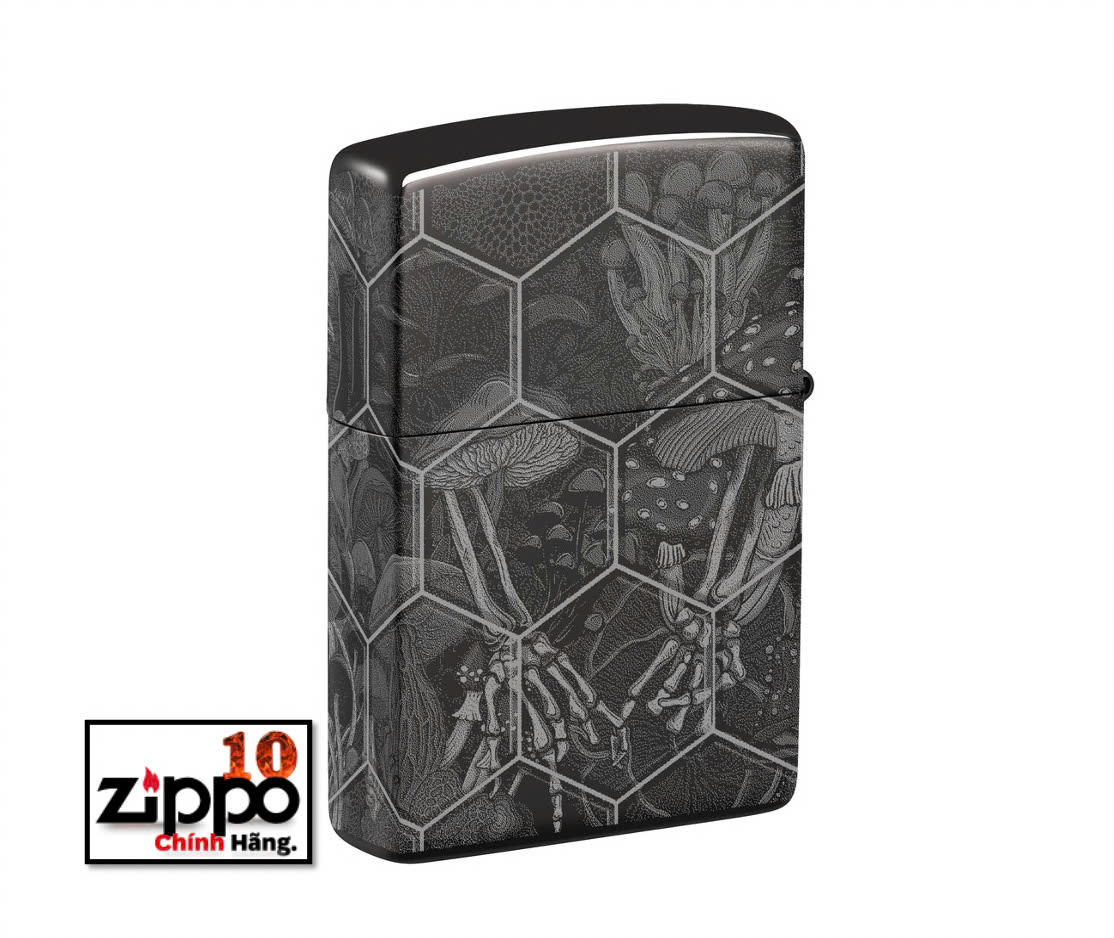Được đóng khung theo họa tiết tổ ong phức tạp, nấm mọc ra từ những hộp sọ đang phân hủy trên mọi bề mặt của chiếc bật lửa High Polish Black cổ điển này với