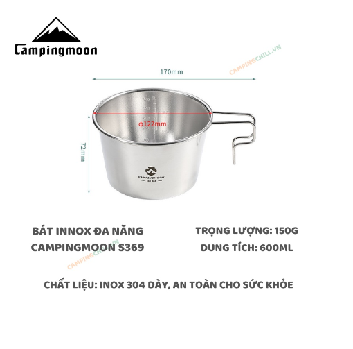 Bát/ Tô cắm trại sâu lòng Sierra Campingmoon S369 chất liệu Inox 304 dày, an toàn cho sức khỏe. Đa năng có thể sử dụng làm bát/tô đựng đồ ăn hoặc sử dụng làm nồi đun nấu trực tiếp vô cùng tiện dụng….Thiết kế tay cầm công thái học phù dễ dàng cầm nắm và có thể xếp chồng lên nhau thuận tiện cho việc lưu trữ và di chuyển, thích hợp với các hoạt động ngoài trời như: trekking, solo Camping, cắm trại, dã ngoại, hikking, câu cá… Thông tin sản phẩm: - Thương hiệu: Campingmoon - Mã sản phẩm: S369 - Chất liệu: Inox 304 - Kích thước: 17012272mm - Trọng lượng: 150g - Dung tích: 600ml - Màu sắc: Bạc - Xuất xứ: Trung Quốc - Lh: 0353227420 Chất liệu thép không gỉ 304 chống ăn mòn, không gỉ sét, an toàn cho sức khỏe và thân thiện với môi trường. Trọng lượng nhẹ, có thể xếp chồng lên nhau thuận tiện cho việc lưu trữ và di chuyển, thích hợp các hoạt động ngoài trời.