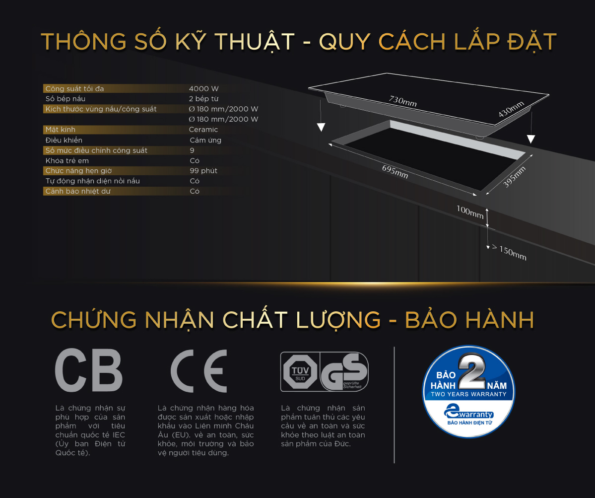 Thông số kỹ thuật + Bếp 02 từ + Mặt kính crystal siêu bền, chịu lực chịu sốc nhiệt + 09 dải công suất + Điều khiển cảm ứng độc lập dạng ẩn trực tiếp