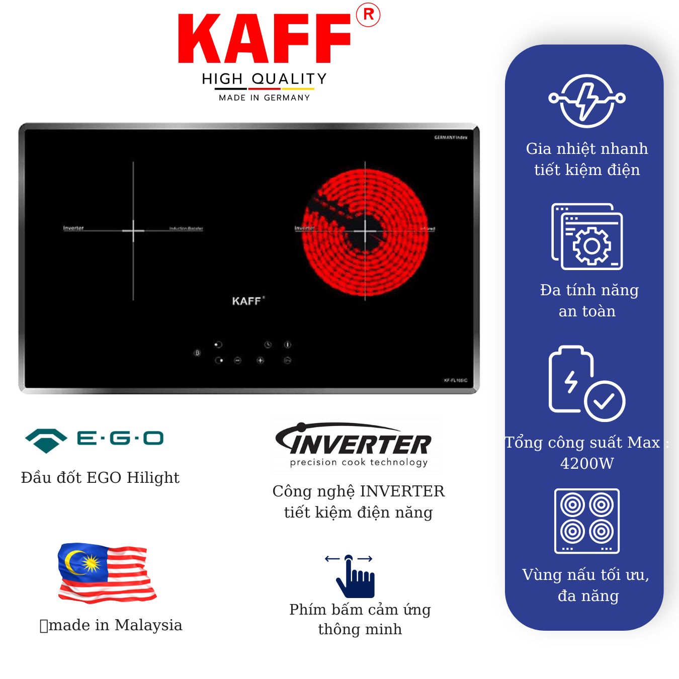 + Bếp điện từ kết hợp: 01 điện + 01 từ – Xuất Xứ: Made In Malaysia + Mặt kính Germany Index siêu bền, chịu lực chịu sốc nhiệt + Đầu đốt EGO Made in Germany