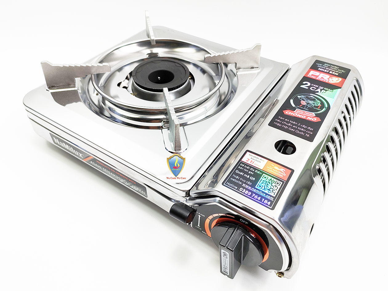 Bếp du lịch sử dụng van ngắt gas an toàn tự động Inline Cut. Bếp sử dụng hệ thống đầu đốt theo tiêu chuẩn JIA (Nhật Bản), kết hợp vòng chắn gió, giúp ngọn lửa