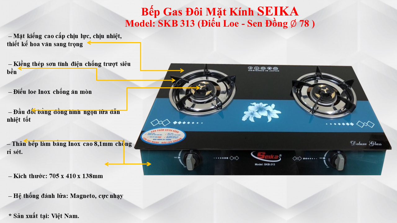 Bếp Gas Đôi Mặt Kính Seika(Sen Đồng)- Mặt kiếng cao cấp chịu lực, chịu nhiệt, thiết kế hoa văn sang trọng - Thân bếp làm bằng inox chống rỉ sét. - Kiềng thép sơn tĩnh