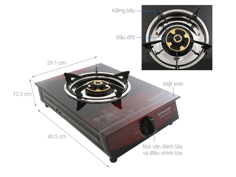 Bếp gas đơn SUNHOUSE SHB212KG có 1 lò đun, điều khiển lửa to nhỏ bằng núm vặn tiện lợi. Mặt kính với gam màu đen & tô điểm họa tiết trang trí vừa mang lại tính thẩm mỹ cao vừa có khả năng chịu lực, chịu nhiệt, đồng thời dễ dàng vệ sinh sau khi sử dụng.