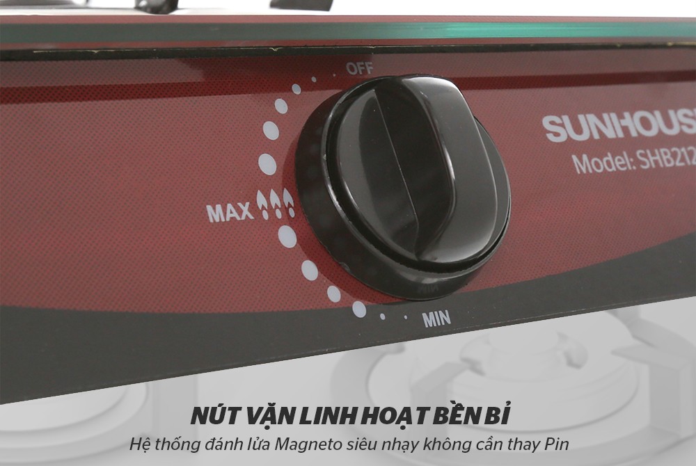 Bếp gas đơn SUNHOUSE SHB212KG sử dụng hệ thống đánh lửa Magneto (còn được gọi là hệ thống đánh lửa cơ), hoạt động dựa trên nguyên lí sử dụng 2 đá lửa đập vào nhau tạo ra ngọn lửa đều và xanh. Hệ thống đánh lửa Magneto điều khiển bằng núm vặn linh hoạt, bền bỉ, ít hỏng hóc, không cần thay pin như ở hệ thống IC.