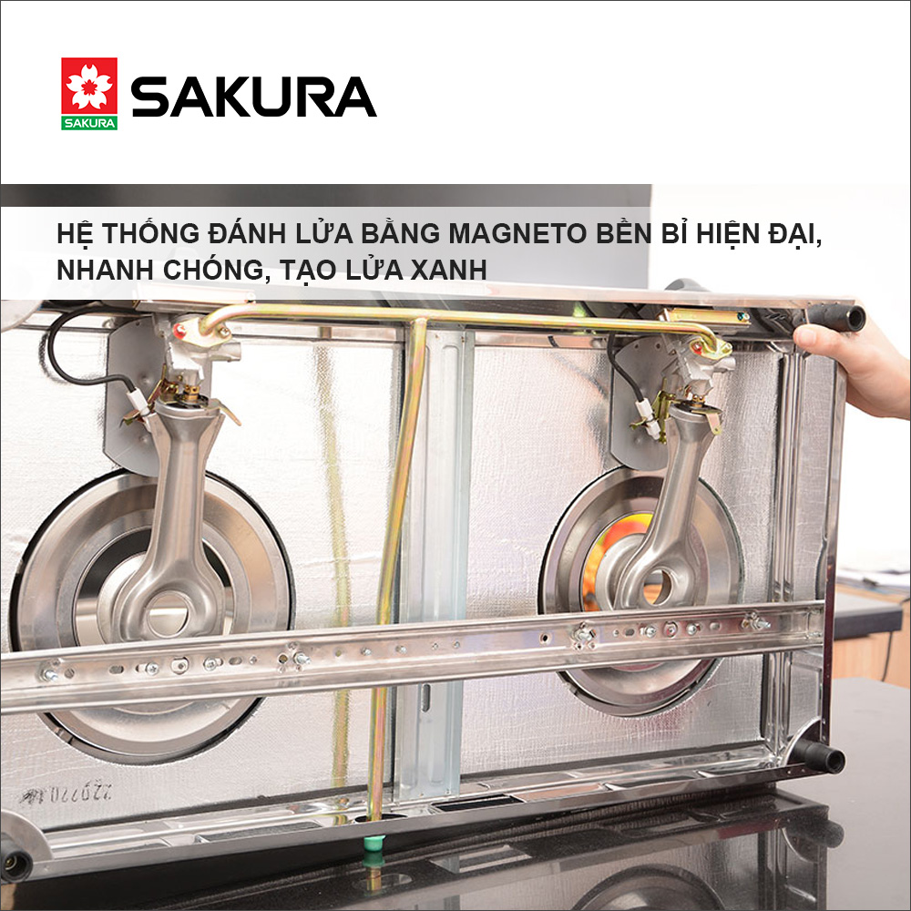 Bếp gas dương Sakura được tích hợp hệ thống đánh lửa bằng Magneto bền bỉ hiện đại, nhanh chóng tạo lửa xanh tiết kiệm gas và là hệ thống đánh lửa được ưa chuộng nhất hiện nay. Cùng với kiềng tráng men độc lập, siêu bền và mức lượng gas tiêu thụ chỉ 0.21kg/h/lò, giúp tiết kiệm gas hiệu quả.
