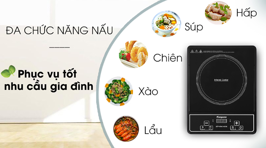 Bếp hồng ngoại thiết lập 8 chế độ nấu gồm nấu thông thường, chiên, hầm, nướng, đun nước, xào, súp, lẩu cho bạn chế biến món ăn đa dạng.