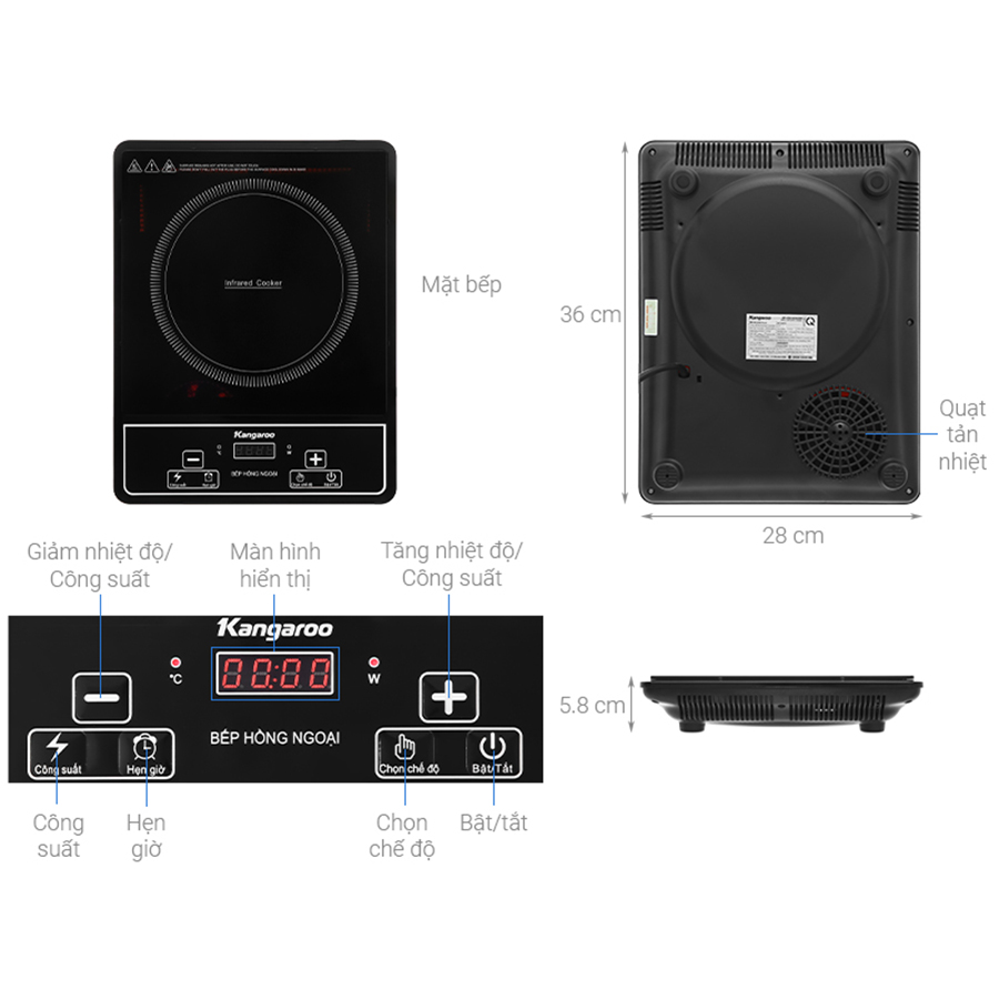 - Toàn thân bằng nhựa chịu nhiệt cao - Mặt bếp bằng kính Ceramic - Dùng được cho các loại nồi - Bộ điều khiển thông minh, nhiều chức năng hiện đại, có khoá trẻ
