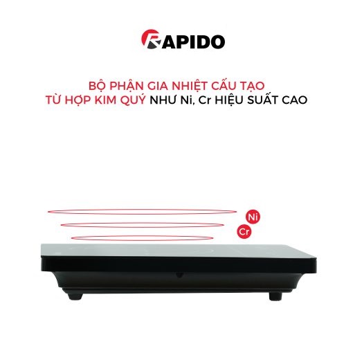 THÔNG TIN SẢN PHẨM 1*Thông số kĩ thuật bếp hồng ngoại đơn Rapido RC2000ES - Công suất 2000w - Loại bếp: Bếp hồng ngoại đơn - Công suất vùng nấu: 2000 W - Chất liệu mặt bếp: Pha lê - Bảng điều khiển: Cảm ứng - Loại nồi nấu: Tất cả loại nồi - Tính năng an toàn: Cảnh báo mặt bếp nóng - Thương hiệu của: Đức - Hãng Rapido. *MÔ TẢ SẢN PHẨM  - Điều khiển cảm ứng - Công suất 2000W - Màn hình hiển thị 4 số, hẹn giờ - Tự động bảo vệ khi điện áp quá cao/quá thấp - Điều khiển đơn giản dễ sử dụng. - Bộ phận gia nhiệt cấu tạo từ hợp kim quý như Ni, Cr hiệu suất cao. - Màn hình hiển thị 4 số, hẹn giờ - Tự động bảo vệ khi điện áp quá cao/quá thấp