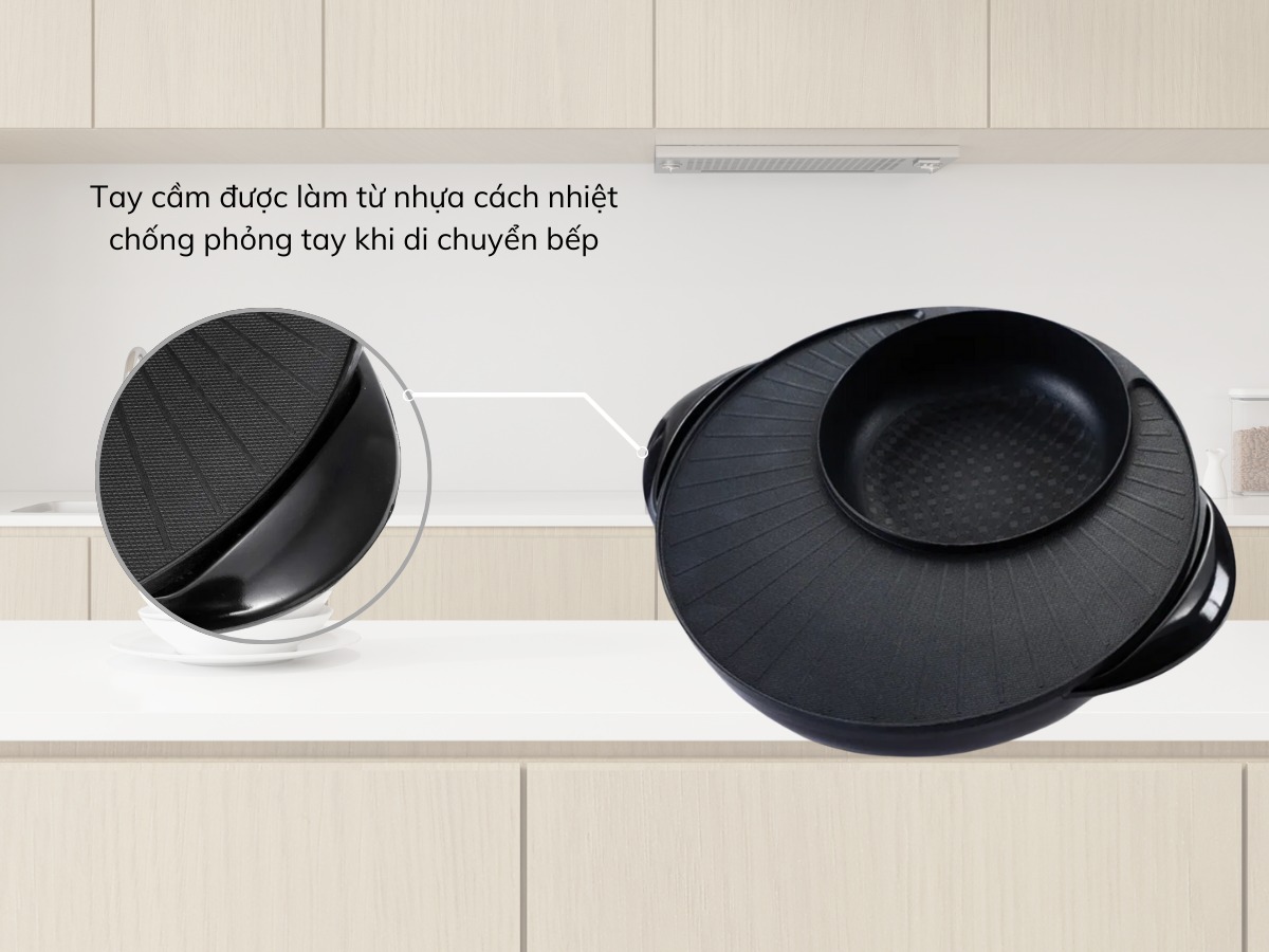 - Bếp lẩu nướng có lớp men chống dính cao cấp giúp thức ăn chống dính tốt, không cháy khét.