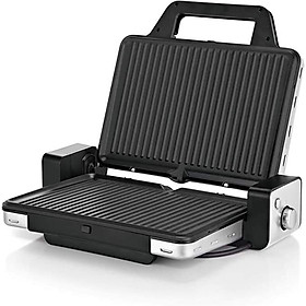 – Hãng sản xuất: WMF – Hàng Nhập khẩu Đức – Công suất: 2100w – Điện áp: 220V – Chất liệu thân máy: Thép Cromagan cao cấp – Kích thước: 45 x 37 x 15 cm; 5.22 Kilograms – Bảo hành: 12 tháng lỗi kỹ thuật. ĐẶC ĐIỂM NỔI BẬT:  – Khi sử dụng là máy nướng kẹp tiếp xúc 2 mặt: Kiểu nướng 10 miếng như 10, ko bắn ,cực it khói ,Kẹp bánh mì, nướng bít tết, thịt, cá chín đều 2 mặt cùng lúc mà không cần lật. – Sử dụng làm bếp nướng tại bàn bằng cách mở 2 mặt máy, ta có 1 bếp ăn tiệc nướng đúng nghĩa. – Cài đặt nhiệt độ có thể lựa chọn tuỳ thích bằng cách xoay núm vặn cơ rất đơn giản và dễ dàng. – Tấm nướng Vario-Flex: Cho phép điều chỉnh độ cao phù hợp với độ dày/mỏng của thực phẩm. – Vỉ nướng chống dính chấy lượng cao thích hợp cho cả các thực phẩm ko sinh dầu mỡ. – Có khay hứng mỡ có thể tháo rời. – Vỉ nướng an toàn trong máy rửa chén. – Công suất 2.100 watt đảm bảo nướng nhanh với nhiệt độ cao. Bạn có thể cài đặt nhiệt độ thích hợp cho món nướng của mình bằng nút xoay điều khiển. – Chất liệu thân máy: Thép Cromagan cao cấp.