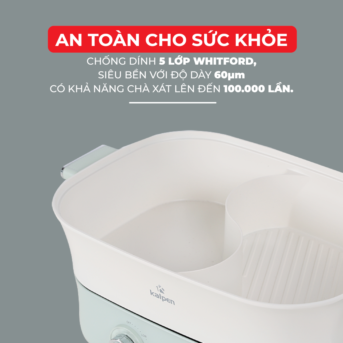 - Chất liệu cao cấp, chống dính cao cấp an toàn cho sức khỏe Bếp nướng lẩu Kalpen 6.5L được làm từ chất liệu nhôm đúc nguyên khối giúp truyền và tản nhiệt đều, làm chín thức ăn một cách nhanh chóng, thức ăn chín đều và giữ được màu sắc tươi ngon của thực phẩm. Bề mặt bếp được phủ chống dính Whitford 5 lớp với độ dày 60µm siêu bền, có khả năng chà sát lên đến 100.000 lần. Chống dính Whitford là dòng chống dính cao cấp đã được FPA Hoa Kỳ công nhận và được sử dụng rộng rãi nhiều nước trên thế giới. Với đặc tính chống chịu tốt với môi trường kiềm, axit…,không chứa chất PFOA, APEO nên rất an toàn cho sức khỏe con người kể cả khi sử dụng lâu dài.