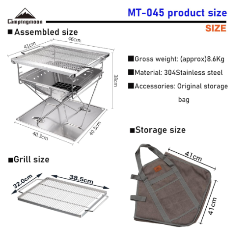 MÔ TẢ SẢN PHẨM BẾP NƯỚNG THAN HOA GẤP GỌN 6-8 NGƯỜI CAMPINGMOON MT-045 * THÔNG TIN SẢN PHẨM: - Thương hiệu: Campingmoon - Mã sản phẩm: MT-045 - Chất liệu: + Lưới nướng: Inox