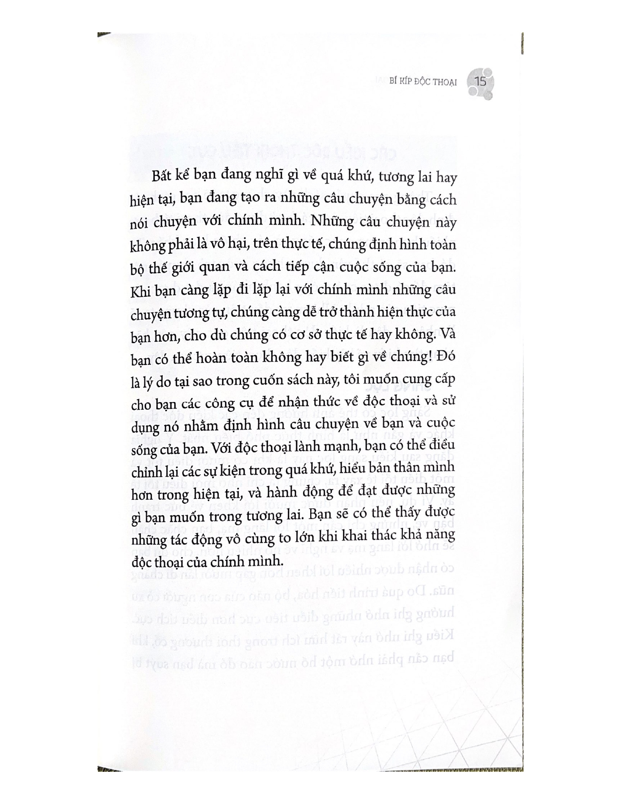 Với những chiến lược và bài tập hữu ích, Bí kíp độc thoại sẽ giúp bạn từng bước xây dựng thói quen suy nghĩ tích cực, học cách chấp nhận và yêu thương bản thân, khai thác lợi ích của những suy nghĩ tiêu cực và biến “độc thoại” trở thành đồng minh tốt nhất trên hành trình hướng đến cuộc sống hạnh phúc.