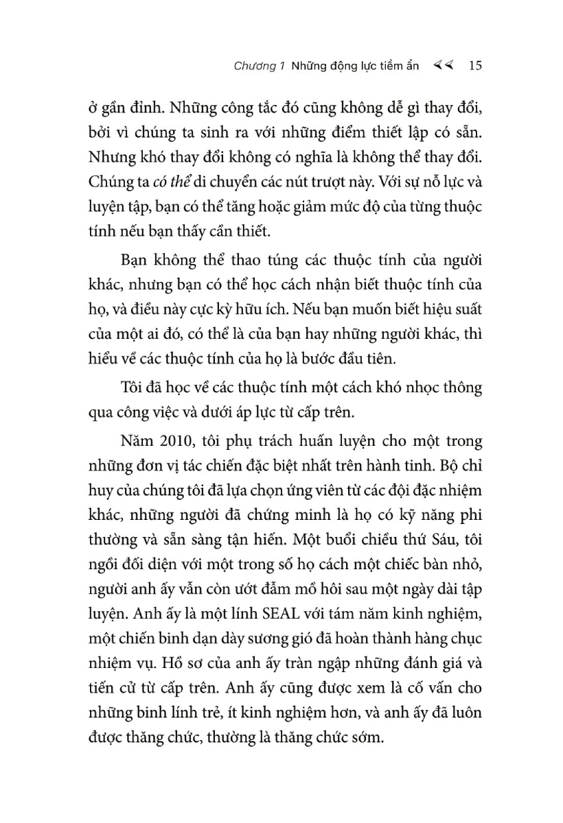 Tác giả Rich Diviney là Trung tá của Hải quân SEAL - lực lượng được mệnh danh là tinh nhuệ nhất quân đội Mỹ, chính là lực lượng đã tiêu diệt trùm khủng bố Bin Laden. Diviney là một trong những người chịu trách nhiệm đào tạo, tuyển chọn lính SEAL cho một đội đặc nhiệm thuộc Hải quân SEAL. Điều mà Diviney và các đồng đội của ông tìm kiếm không phải là kỹ năng, mà chính là các “thuộc tính”.