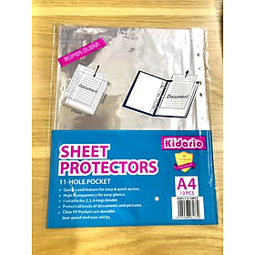 Bìa Lỗ A4 Dày Kidario KSP11-8-100PCS (900g): - Kích thước: A4 - Màu sắc: Trong suốt - Bìa lỗ gồm 11 lỗ ngay bên rìa trái của sản phẩm. Hàng lỗ này có tác