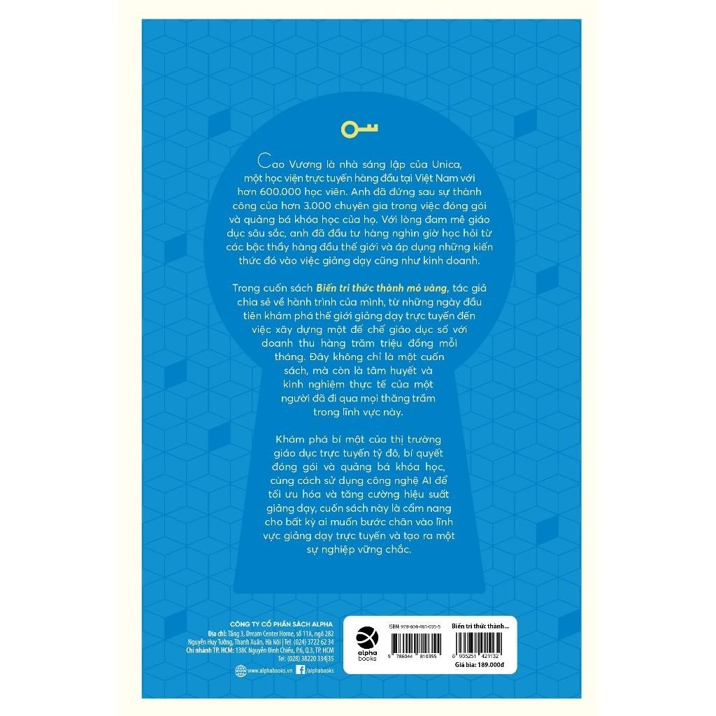 Mua tại TiktokSách: Biến Tri Thức Thành Mỏ Vàng - Bí Quyết Xây Dựng Khóa Học Online Và Trở Thành Chuyên Gia Đào Tạo (Alpha Books) THÔNG TIN MÔ TẢ Tác giả: Cao Vương Nhà phát hành: Alpha Books Nhà xuất bản: NXB Công Thương Số trang: 240 Bìa mềm tay gấp Khổ sách: 16x24cm Năm xuất bản: 2024 MÔ TẢ SẢN PHẨM TÓM TẮT SÁCH Cuốn sách này được chia thành năm phần chính, bao gồm: Chạm tay vào thị trường tỷ đô, Lộ trình xây dựng khóa học trực tuyến từ A - Z, Bí quyết thu hút học viên đến khóa học, Bí mật của webinar và bootcamp, Suy nghĩ như một nhà đào tạo triệu phú. Mỗi phần đều bao gồm các chương chi tiết, với các bước cụ thể, chiến lược và bài tập để giúp bạn áp dụng những gì đã học vào thực tế.