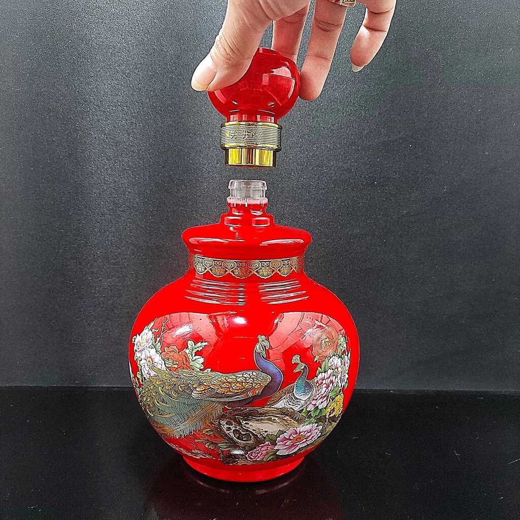 Glass bottle 1500ML – Ground shape – Lucky Red color - Peafowl pattern (H1)