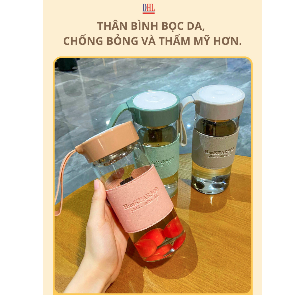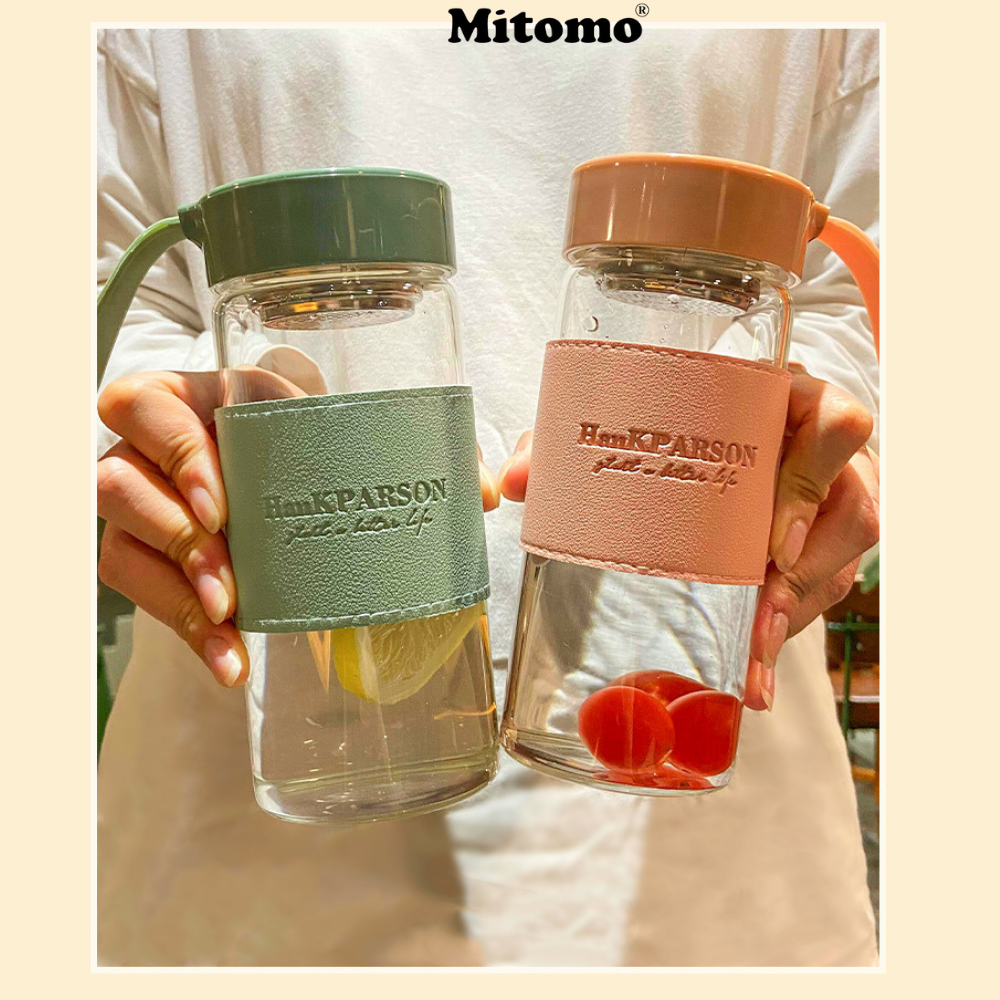 ✨Bình Nước Thủy Tinh Cao Cấp Bọc Da Mitomo, Chịu Lực, Chịu Nhiệt, Có Dây Đeo Kèm Bộ Lọc Inox 304 Dung Tích 500ML hàng chính hãng