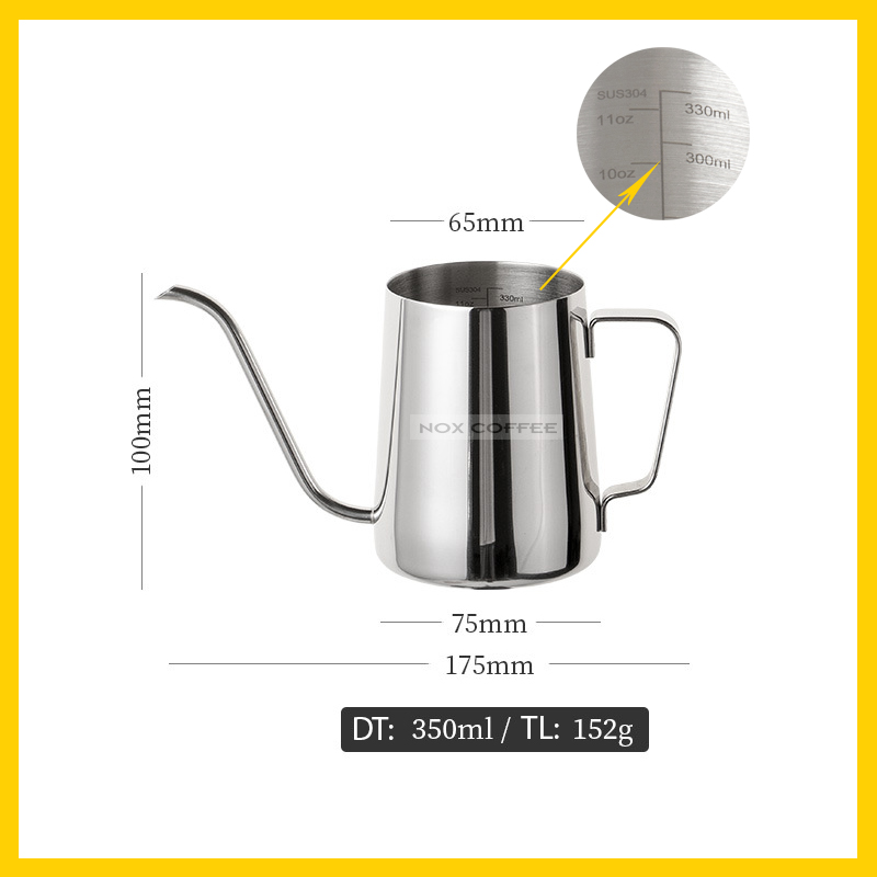 Ấm có dung tích 350ml, nhỏ gọn, phù hợp với những người có nhu cầu pha đơn giản, hay với những người mới chơi bộ môn cà phê thủ công và chưa muốn đầu tư quá nhiều vào những dụng cụ pha đắt tiền.