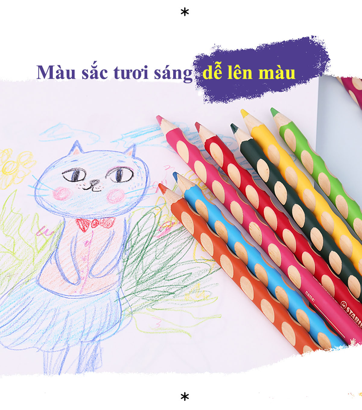 - Bút chì màu hình thể học đầu tiên cho trẻ tập cầm viết đúng cách - Thân tam giác, vị trí cầm khắc sâu trên thân bút - Có khung viết tên, dễ dàng