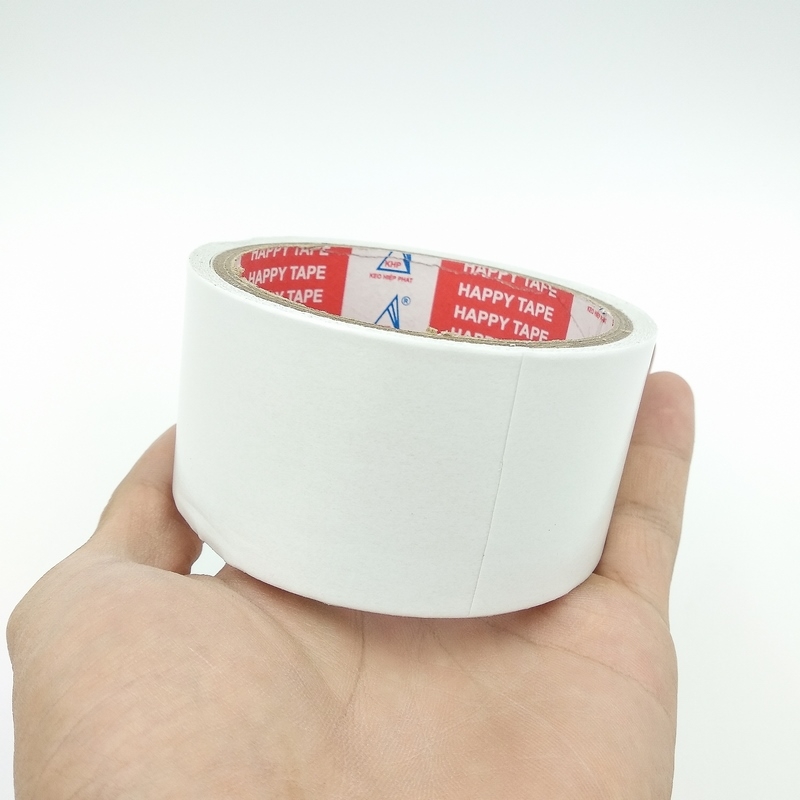 - Băng keo hai mặt ở chính giữa có một lớp giấy lụa dẻo và dai được phủ lên 2 lớp keo cho cả 2 mặt giấy, sử dụng loại keo có độ dính rất