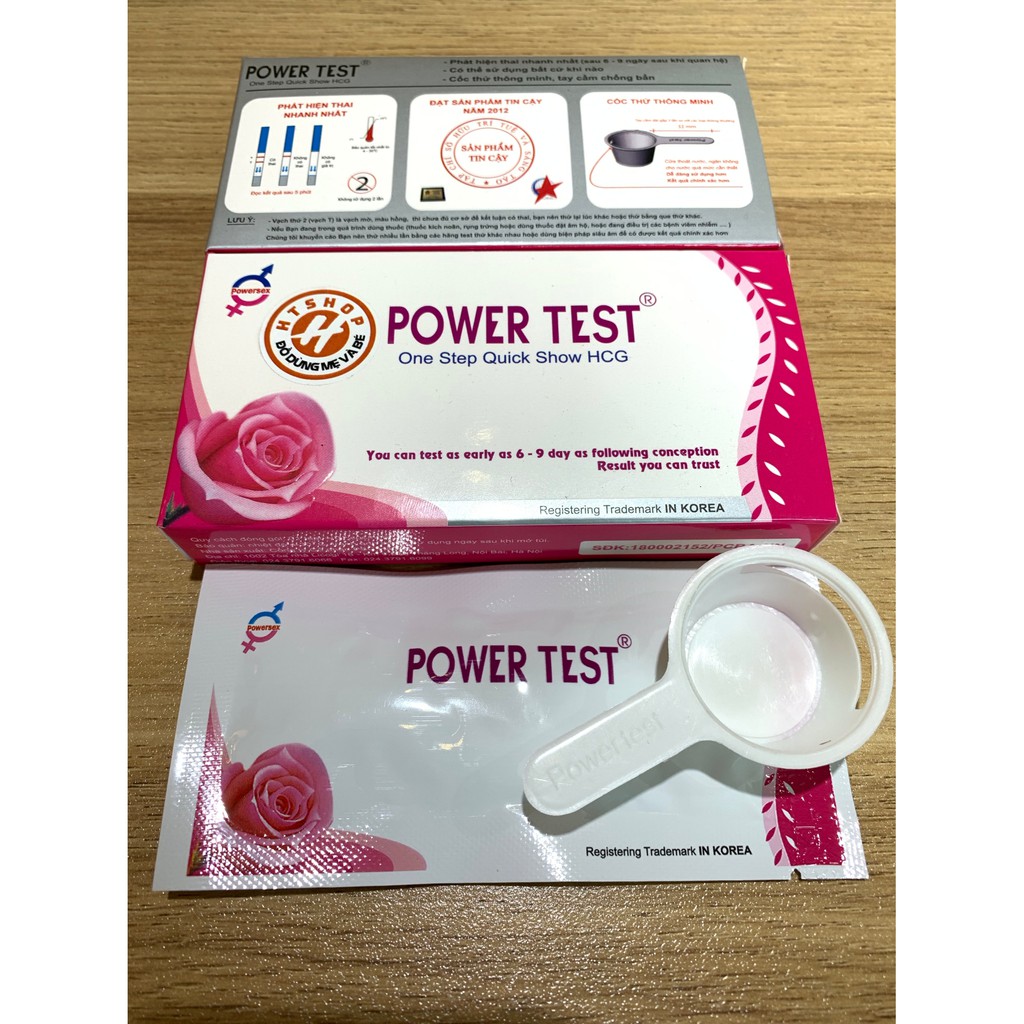 Tên sản phẩm: Que thử thai PowerTest Kích thước test: rộng 5mm Tính năng: Phát hiện thai sớm sau 6 -9 ngày trứng rụng ƯU ĐIỂM: Phát hiện thai sớm sau 6 -9 ngày