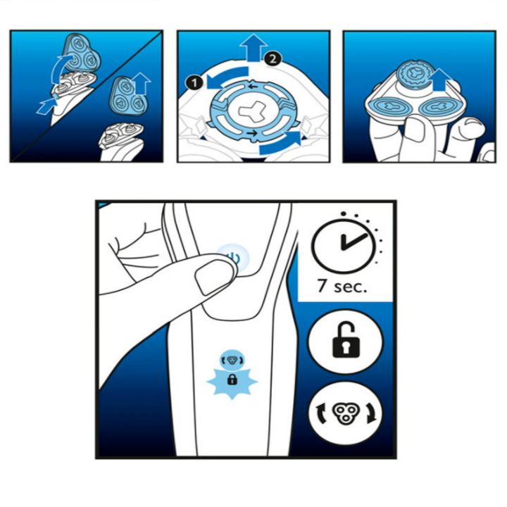 - Sau khi thay đầu cạo, bạn có thể đặt lại lời nhắc thay thế bằng cách nhấn nút bật / tắt trong hơn 7 giây. Nếu không, kích hoạt thay thế sẽ tự động tắt sau 9 lần cạo liên tiếp. * Để có hiệu suất cạo tối đa, bạn nên thay đầu cạo 24 tháng một lần