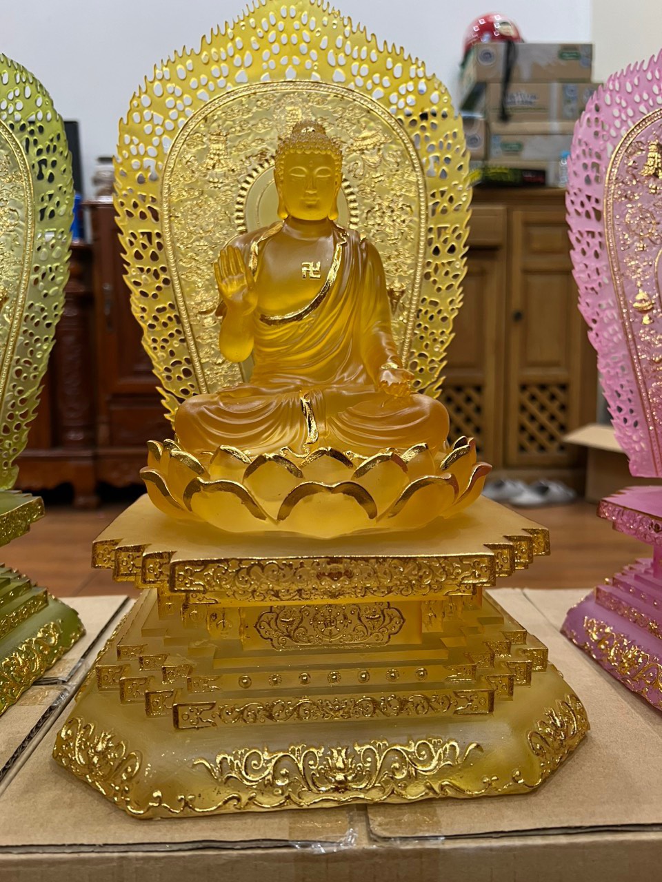 Tượng Phật Quan Âm Đá Lưu Ly Vàng Mới để trong xe hơi hoặc để bàn cao 12cm đk 7cm đế 5cm Mệnh Kim mệnh Thổ mệnh Thủy ạ *** Tượng Phật Quan Âm Đá