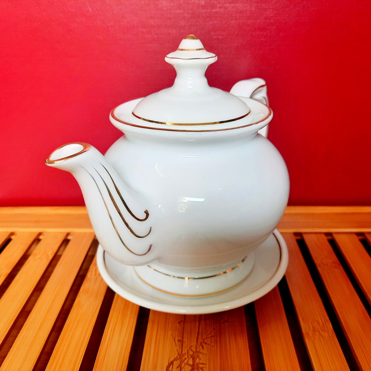 ✨Bộ ấm chén Bát Tràng men trắng viền vàng kim dáng phú quý kèm hộp làm quà tặng sang trọng