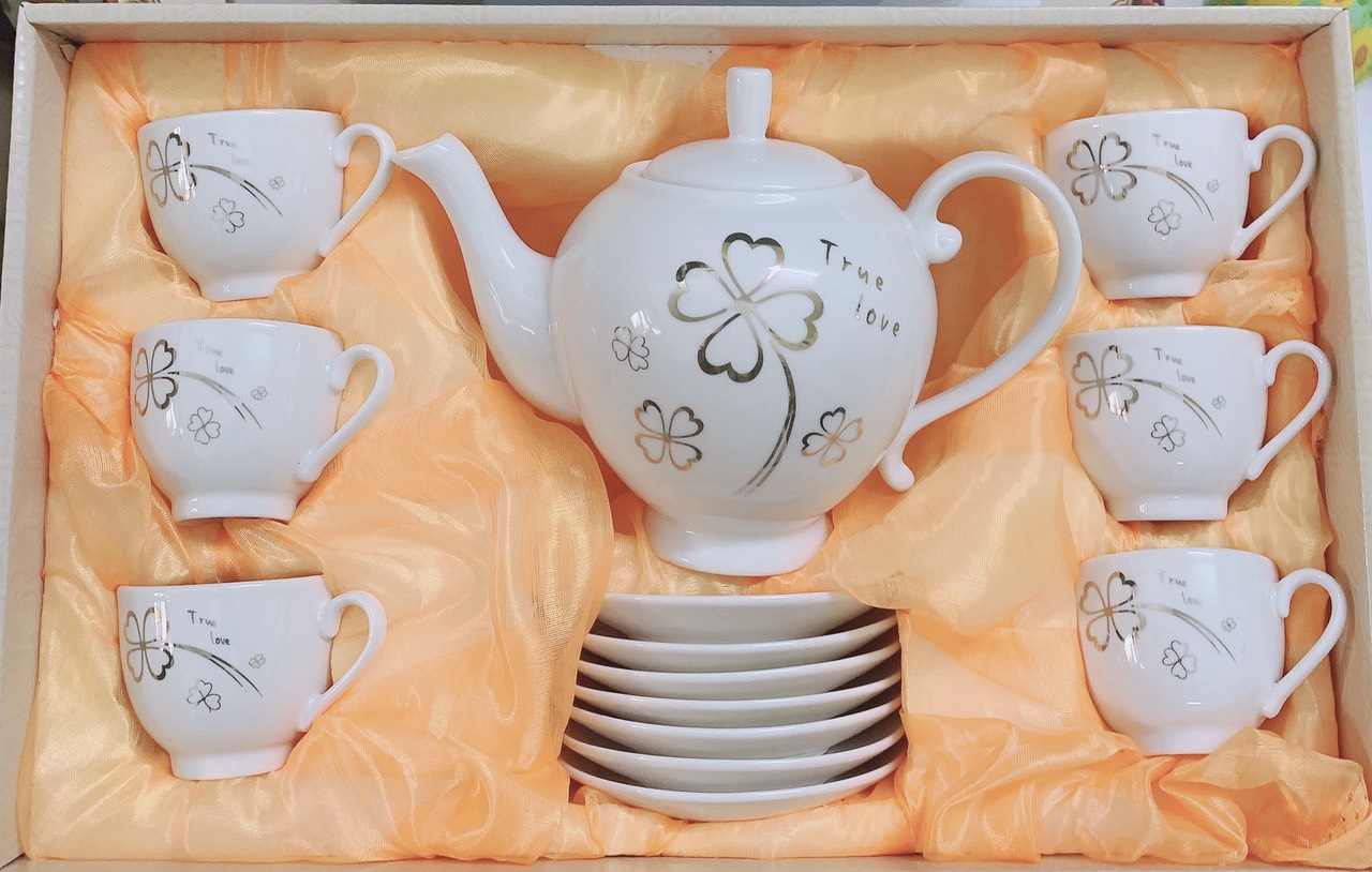 Một bộ sản phẩm bao gồm: 01 ấm, 01 đĩa ấm, 06 chén và 06 đĩa chén. Bộ sản phẩm được làm từ chất liệu gốm cao cấp, bảo đảm an toàn vệ sinh