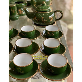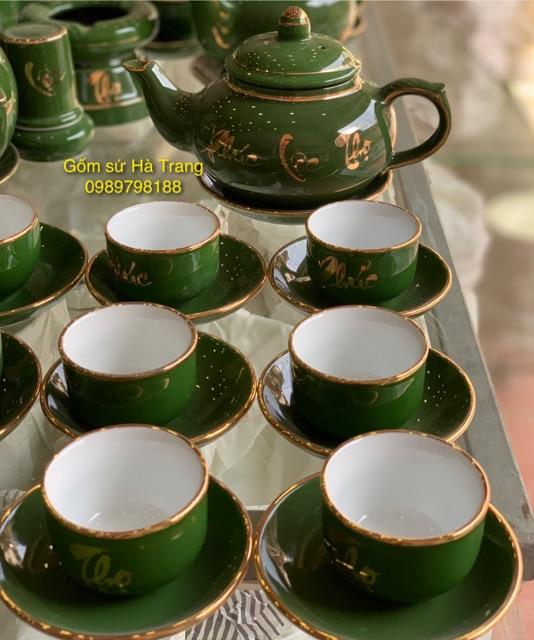 Bộ ấm chén Phúc Lộc Thọ dáng chóp men lục bảo vẽ vàng Gốm sứ Bát Tràng cao cấp Dung tích 430ml 1 ấm 6 chén 7 đĩa kê giá 650k