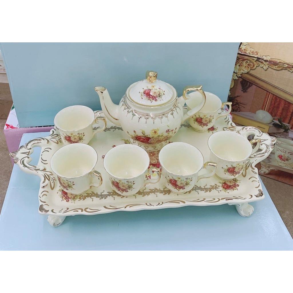 ✨BỘ ẤM CHÉN SỨ HOA MẪU ĐƠN THẤP PHONG CÁCH HOÀNG GIA KÈM KHAY VIỀN VÀNG CAO CẤP