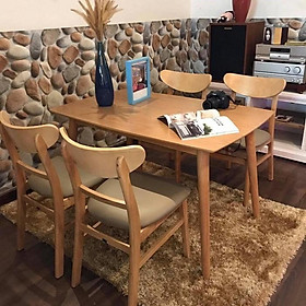 Mô tả sản phẩm - Kích thước bàn 1,2m*75cm, cao 75cm - Kích thước ghế 45*45*80cm - Chất liệu gỗ cao su tự nhiên, chất liệu nệm: simili - Mặt bàn HDF Lỗi xanh -