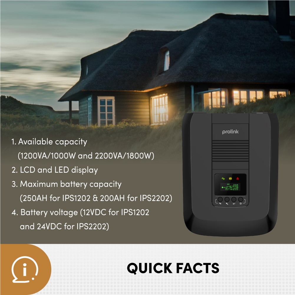 - IPS của Prolink là thiết bị lưu điện phù hợp cho hộ gia đình và hệ thống an ninh CCTV. IPS Prolink cung cấp nguồn điện xoay chiều cho các thiết bị điện, cấp điện liên tục trong thời gian mất điện, hỗ trợ ổn định điện áp.