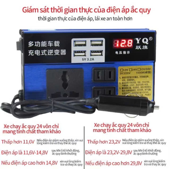 Công suất: DC 150W Tích hợp 4 cổng sạc USB3A và 2cổng 220V Có đèn Led hiển thị. Bộ chuyển nguồn điện xe ô tô chính hãnglà bộ sản phẩm chuyển đổi nguồn dành cho