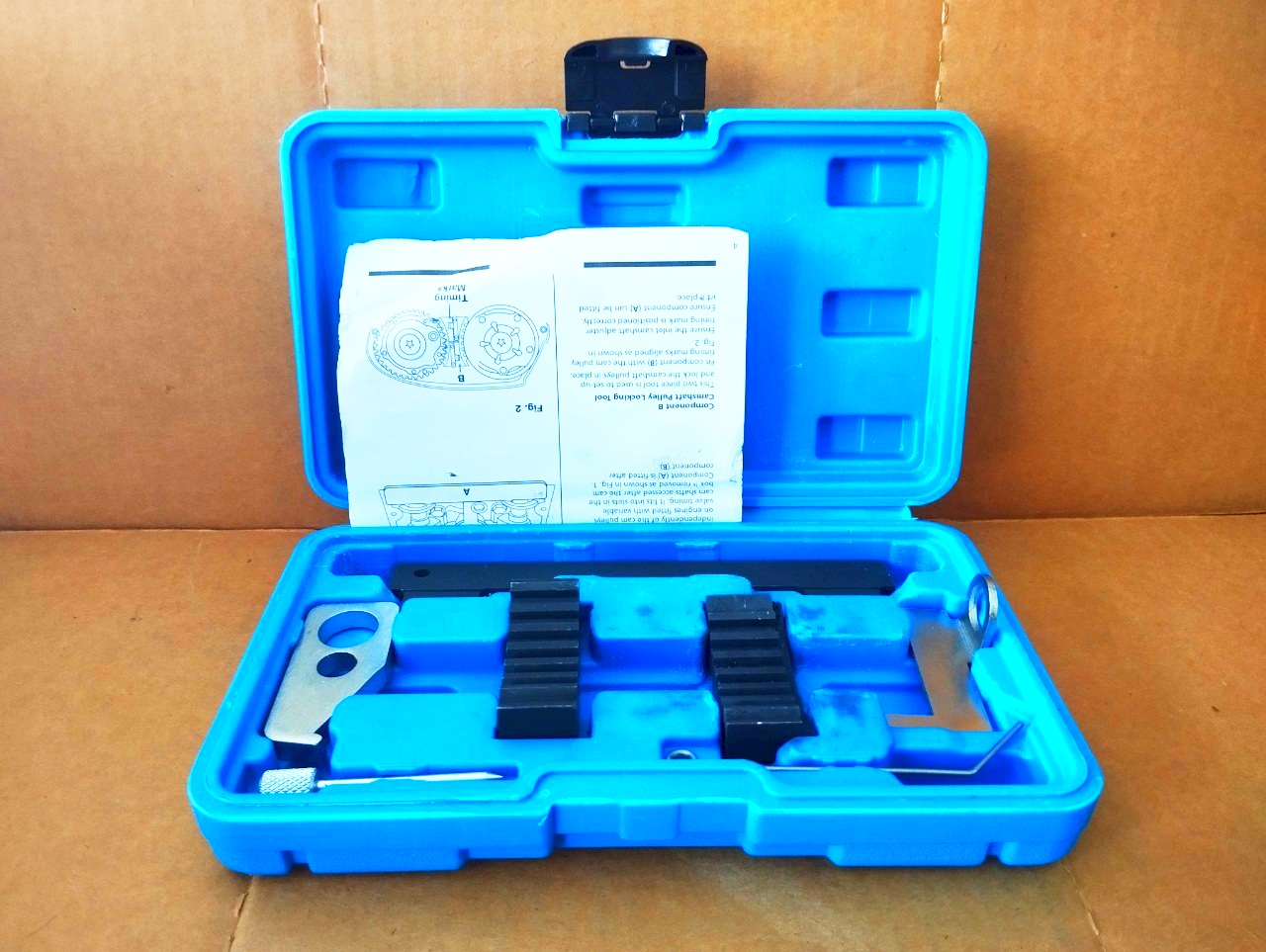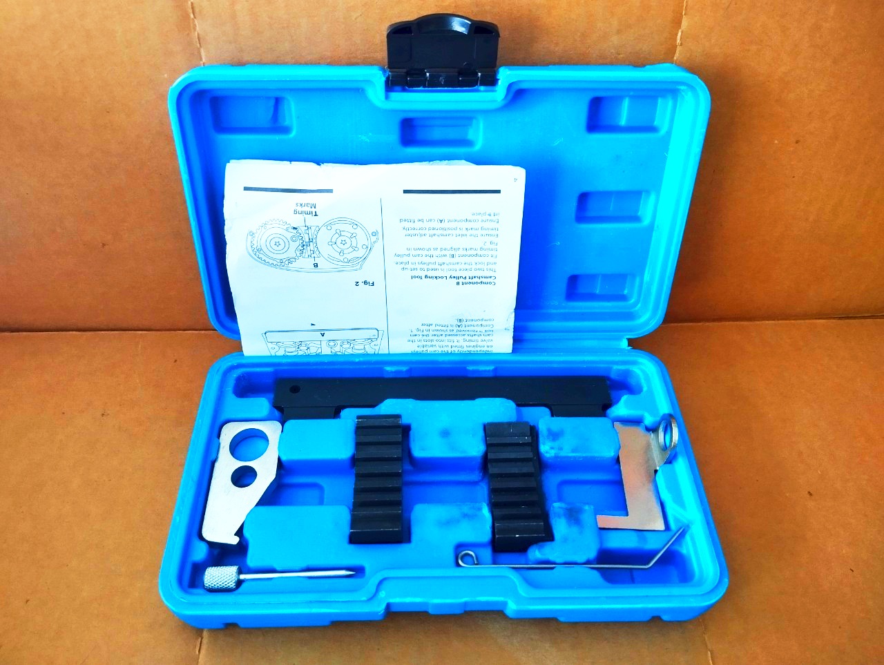 - Bộ tool bao gồm : 1 dụng cụ khóa trục cam 2 dụng cụ khóa bánh răng trục cam 1 dụng cụ khóa bánh đà 1 cờ lê căng đai động cơ 1 dụng cụ khóa căng đai gân chữ V 1 dụng cụ khóa trục khuỷu 1 dụng cụ khóa căng đai định thời Trình tự tiến hành:
