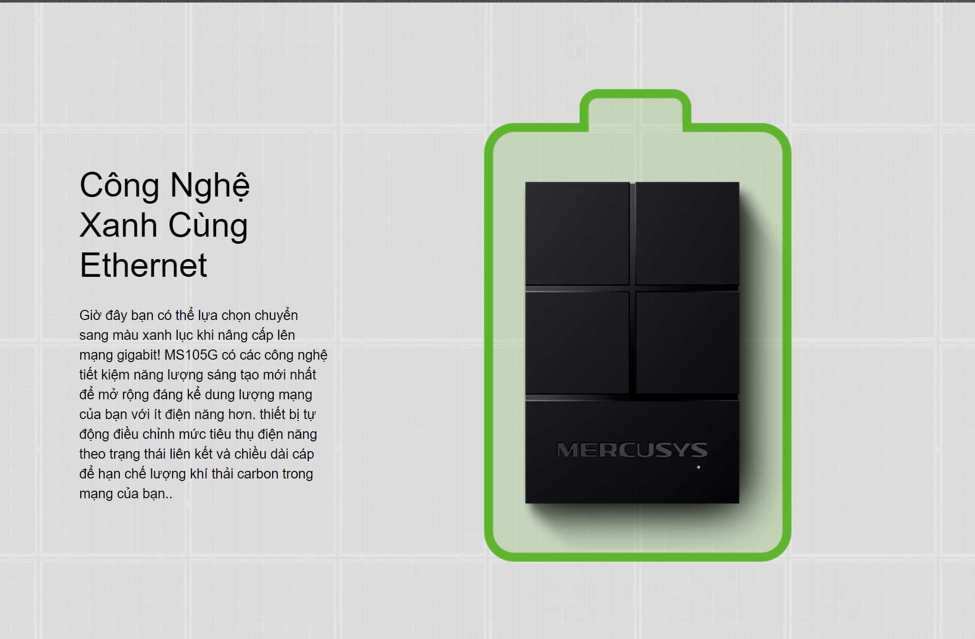 8 cổng RJ45 10/100Mbps với kỹ thuật chiếm quyền điều khiển cáp (Auto-Negotiation) và hỗ trợ tính năng MDI/MDIX Công nghệ Ethernet xanh giúp tiết kiệm điện năng tiêu thụ Kiểm soát lưu lượng IEEE