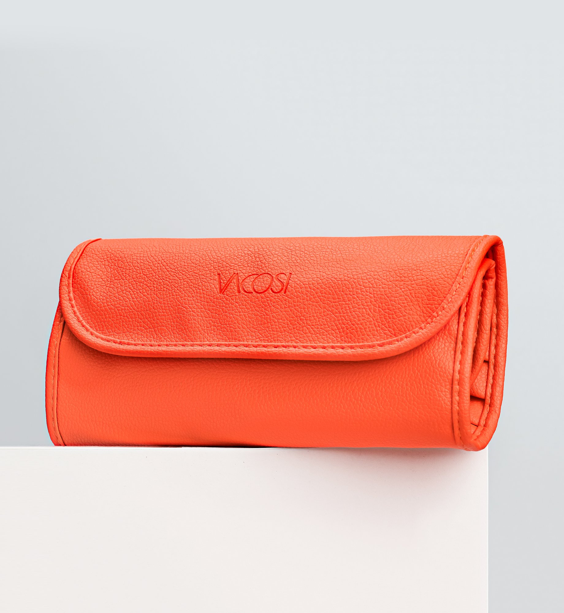 Thiết kế dạng bóp da cầm tay với sắc cam nổi bật phong cách, giúp bảo vệ cọ khỏi tác động của bên ngoài, đồng thời giữ vệ sinh cho cọ tốt hơn.