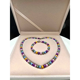 Chất liệu: Ngọc trai nuôi Kích thước: Hạt 8 - 9 mm Bao gồm: Dây chuyền đeo cổ, vòng đeo tay và bông tai Sang trọng để làm quà tặng người phụ nữ yêu quý