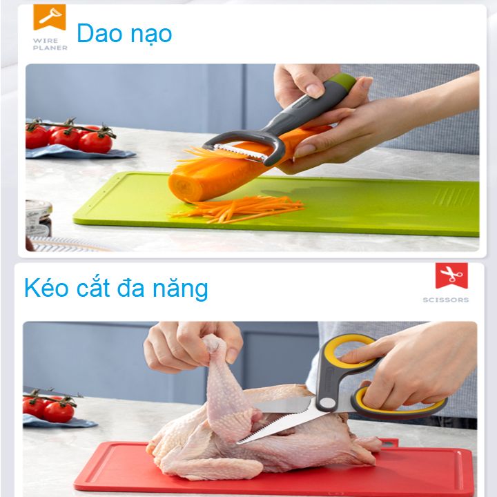 - Bộ dao thớt chuyên nghiệp: Dùng phân loại thực phẩm sống, chín dễ dàng.