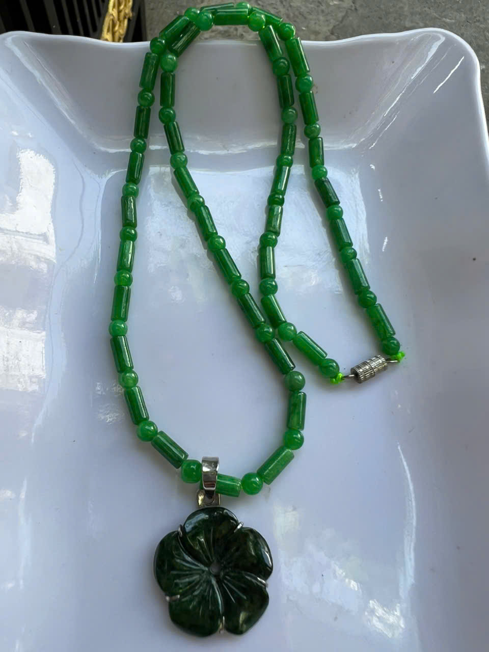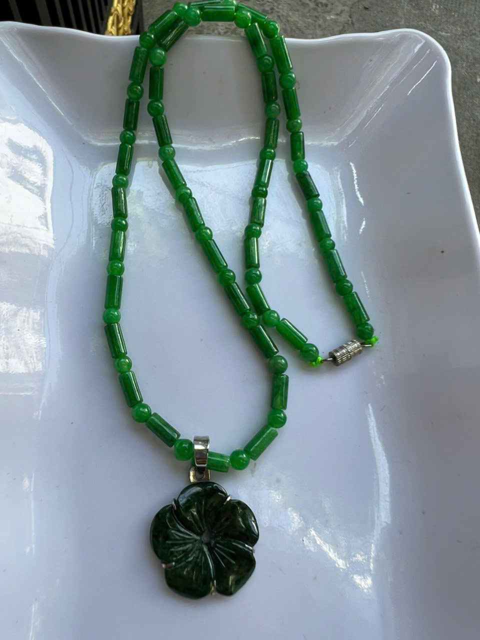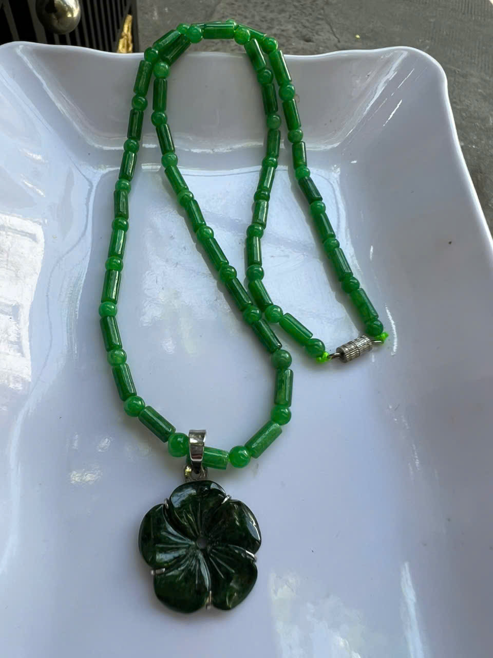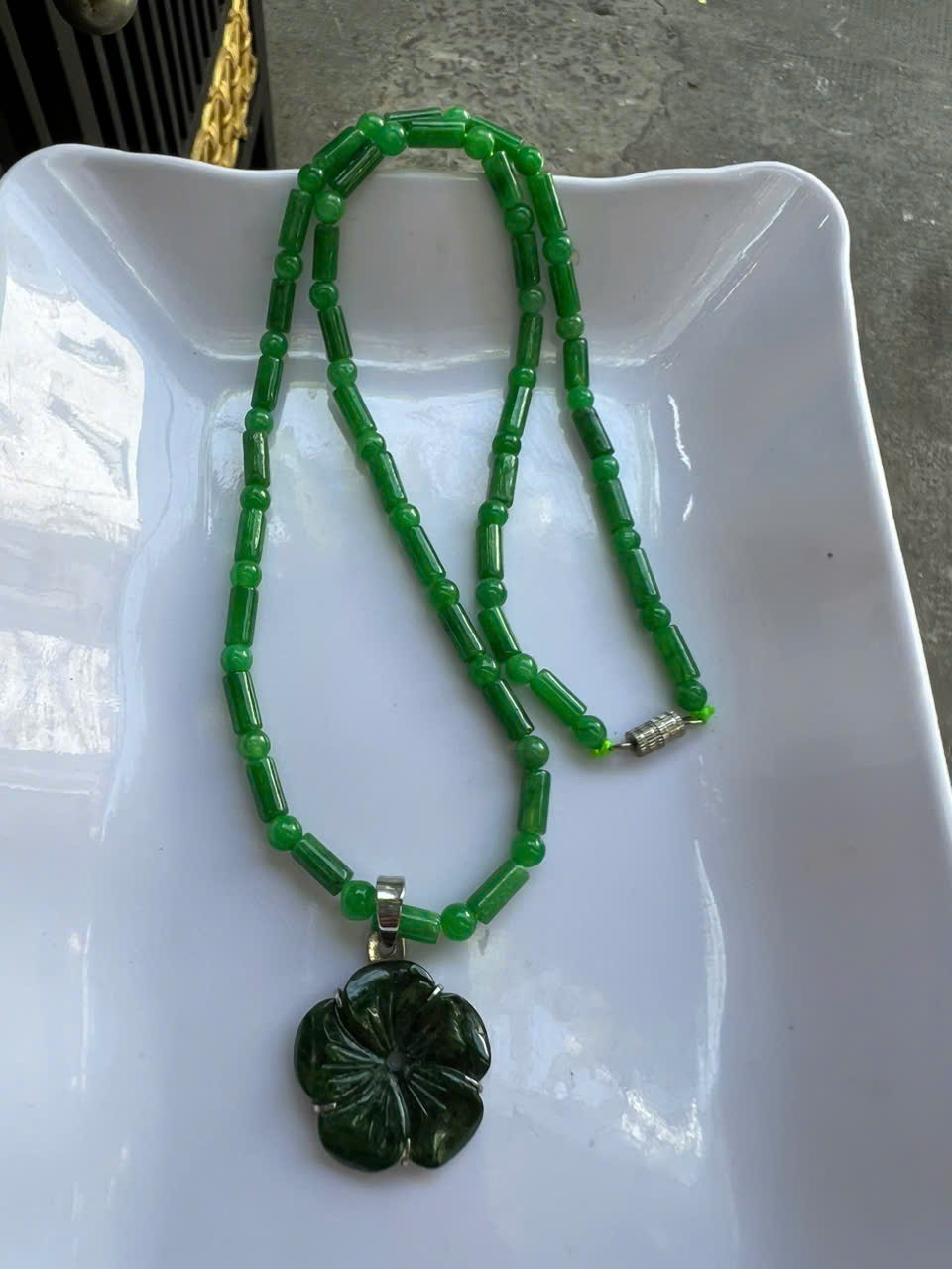 Thiết kế độc đáo: Bộ dây chuyền sợi trúc kiểu xanh phối mặt bông hoa mai. Đá cẩm thạch tự nhiên xanh ngọc đậm đẹp.