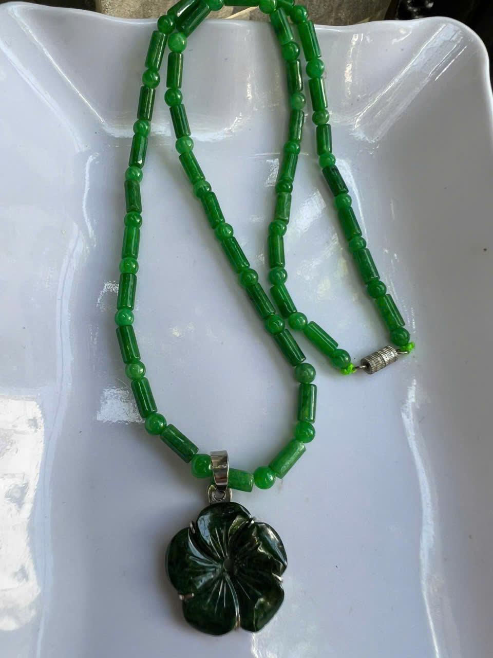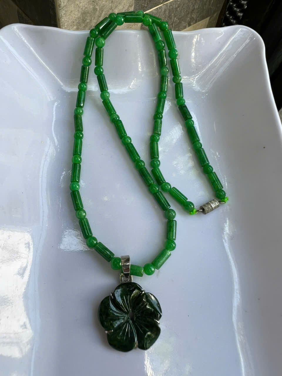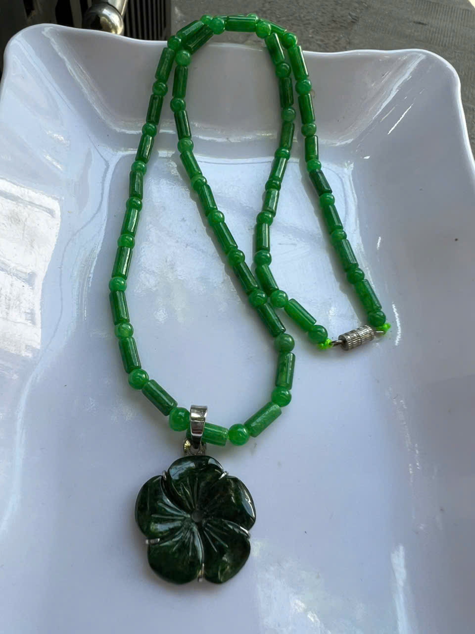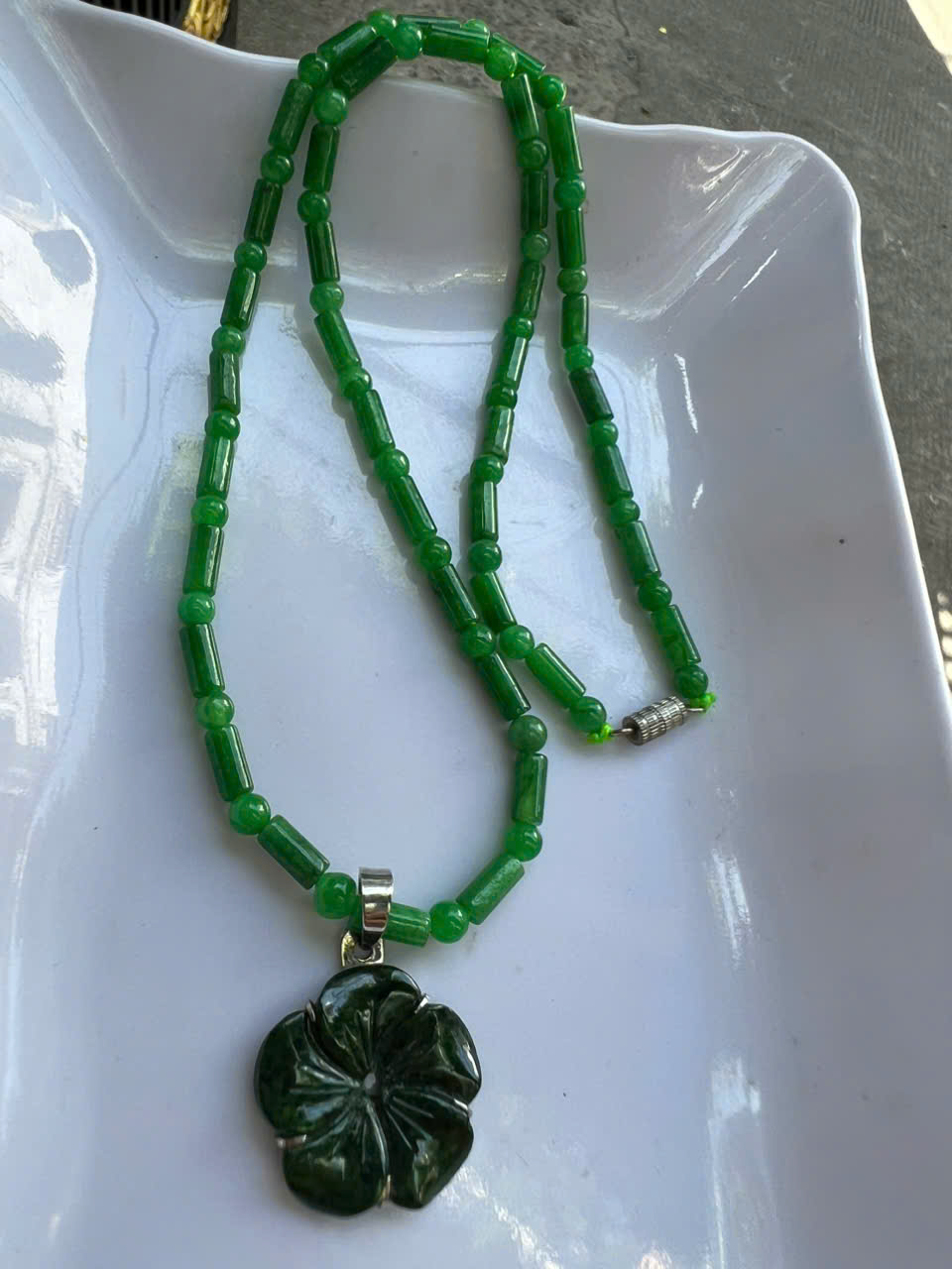 Thiết kế độc đáo: Bộ dây chuyền sợi trúc kiểu xanh phối mặt bông hoa mai. Đá cẩm thạch tự nhiên xanh ngọc đậm đẹp.